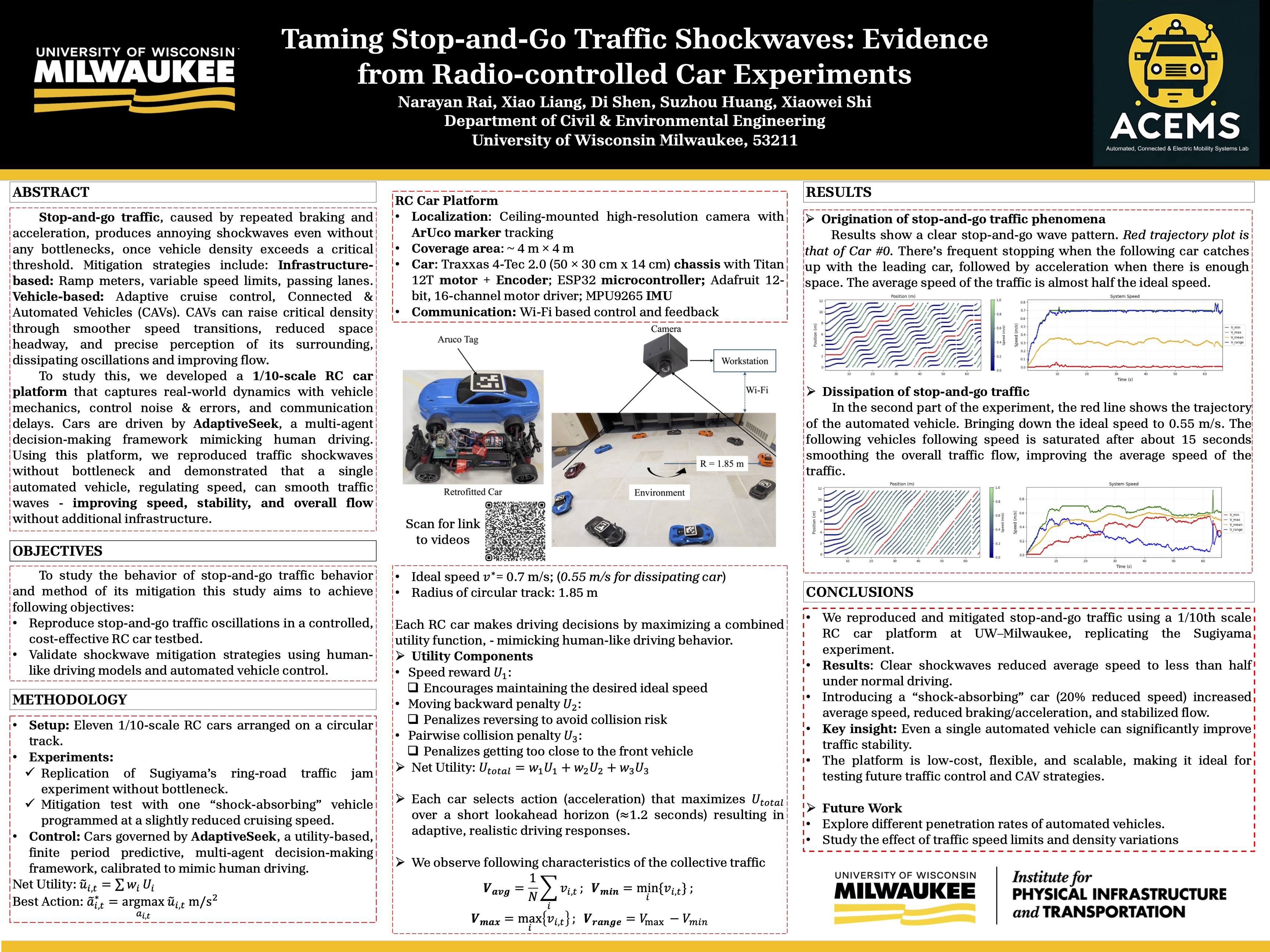 Rai, N., Liang, X., Shen, D., Huang, S., and Shi, X., 2025. Taming Stop-and-Go Traffic Shockwaves: Evidence from Radio-controlled Car Experiments. 2026 TRB Annual Meeting. 【details】